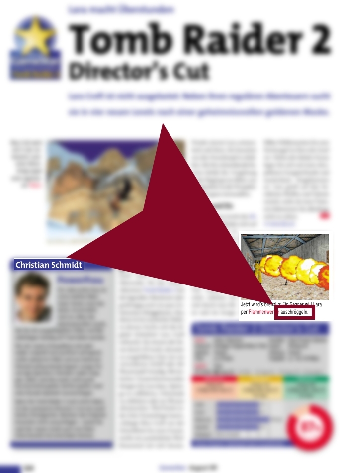 Schau an, und schon hier ist Chris Peller schon um keinen blumigen Ausdruck für unser aller "liebstes" PC-Heft-Titelmotiv verlegen. Ja, gemeint ist: - das virtuelle Sexsymbol - ein neuer Superstar des Spielegenres - diese emanzipierte Lady - die wehrhafte Maid - dieser weibliche Indiana-Jones-Verschnitt - die Protagonistin (2x) - die selbstbewußte Dame - das Mädel - die agile Lady - die Heldin - das Sportwunder - die Lady - die Abenteuerin - das Superweib - die Aktrice Na, ein paar dieser Formulierungen hat der Herr dann ein Jahr später nochmals verwendet. Und mal schauen, was die Kollegen sich so haben einfallen lassen. Da wären Arthur Hoffmann, Henrik Fisch und Manfred Duy mit lediglich: - die junge Polygondame - die Protagonistin - die Lady - eine kurvenreiche Dame - die süße/wohlproportionierte Lara Das ist also selbst für zwei Seiten nicht viel. Aber zum Glück gibt's ja die Computec-Publikationen, und da wird vom Stangl-Florian mit wesentlich mehr Text auch eine entsprechende Anzahl an Synonymen erdacht. Nämlich: - die halbnackte Kanone - die aparte Brünette - das (attraktive) Polygonwunder (2x) - eine Mischung aus James Bond und Indiana Jones - die smarte Polygon-Britin - eine echte Abenteuerin - die Modepuppe - die aparte Lara - die/unsere (holde/smarte) Heldin (4x) - eine waschechte Revolverbraut - die Polygonfrau - die/unsere (aparte) Abenteuerin (2x) - das Bond-Girl - die gute Frau - das flotte Mädel - das agile Superweib - Kollegin Croft (ach, die arbeitet auch bei der PC Games?)- der attraktive Indiana-Jones-Verschnitt Und Herbert Aichinger drüben bei der PC Action? Da geht's weitaus banaler los, aber dann...: - eine weibliche Hauptfigur - Core Designs Vorzeigeheldin (vor all den nicht so ansehnlichen Heldinnen, die Core Design sonst so in ihren Spielen verbraten hatte...)- eine/die/unsere (hübsche) Heldin (3x) - diese Polygon-Powerfrau - Miss Croft (3x) - Konkurrentin von lebenden Supermodels wie Claudia Schiffer oder Naomi Campbell - die smarte Tomb-Raider-Heldin - die Hauptdarstellerin - die wagemutige Taucherin In der zweiten Hälfte geht Aichinger allerdings die Luft aus, und auch die Videospielhefte legen - außer Georg Döllers "Lara-Babe" - nicht wirklich was einschlägiges vor. Trotzdem: Auch hier ist das Nachstöbern eine recht erheiternde Angelegenheit. |